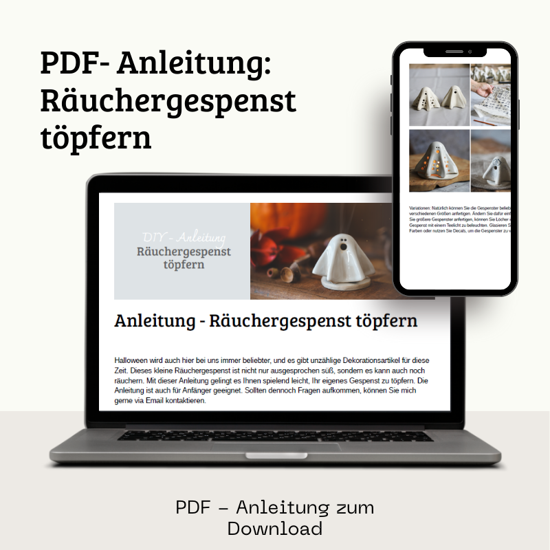 Nach Zahlungseingang könnt Ihr Euch meine Anleitung "Räuchergespenst töpfern" direkt als PDF herunterladen. Die PDF-Datei hat eine sehr hohe Qualität und ist somit auch perfekt für den Ausdruck geeignet. Die Datei hat eine Größe von ca. 30 MB.